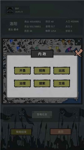 【招商】提高当前城池的商业发展度。商业发展度高,每年的3、6、9、12月份的税收也会提高,有钱才能进行【宴请】、【征兵】等其它的指令;