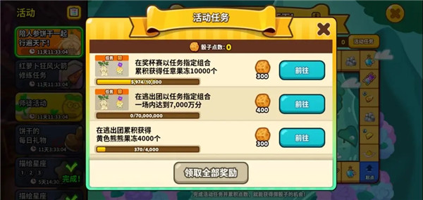 1、活动必须参加,活动可以提供新的饼干人,新的道具以及皮肤等等,非常丰厚,比如:其中有一个用人参饼干的组合在竞技场跑出250,000,000的分数,我觉得这个任务对新手来说也许有一点难度(饼干等级太低血量不够跑下去)这个时候咱们就可以去到烂3进行练习,得到的分数也是会计入活动的(以后类似的活动想达成但是担心去奖杯赛会掉分的就可以用上了;