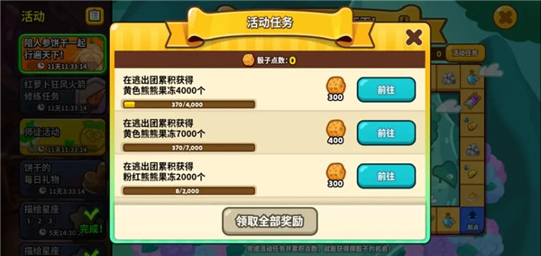 3、熊熊果冻的数量非常充足(但是不能在追求250,000,000分的过程中同时完成这个任务,因为人参饼干的宠物会把黄熊熊果冻变成蜂蜜桔梗果冻,这样就不会被计分,这时可以换成血量更高的饼干,尽量跑远一些)