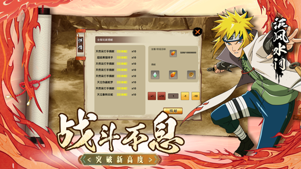 2、组合技能技巧:游戏中具备不同牵绊的角色能够触发独特的组合技能,例如漩涡鸣人与宇智波佐助的组合技能,以及水门与玖辛奈等角色的组合技能。