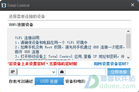 2、在客户端点击wifi连接按钮,可切换至 WiFi 连接界面,将手机设备上出现的同一网段下的 IP 和密码 ( 若未在手机端设置密码,则无需填写密码框 )填写至文本框 , 点击立即连接即可:
