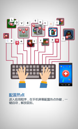 这是一款针对Android系统设计的手机应用程序,支持通过WiFi或USB数据线将手机屏幕内容实时、高速地传输到电脑显示器上。此外,用户可以在电脑上使用鼠标或键盘来操作手机,利用键盘发送短信,在PC屏幕上播放手机视频,同时以MP4格式录制视频和音频混合文件,进行文件管理和传输,接收消息通知,通过投影仪展示和推广手机及应用,以及录制和回放手机屏幕与自动化脚本等。但需注意,total control手机端仅作为连接设备,若要在电脑上实现对手机的控制,还需在电脑上安装total control 电脑端。