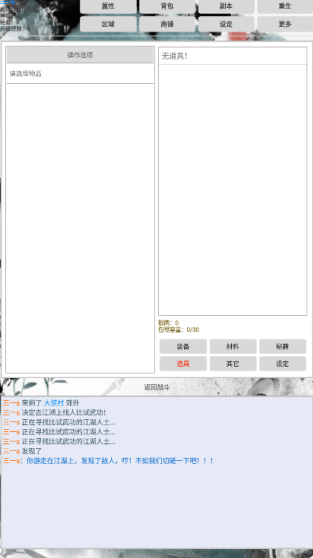 纯文字的江湖 修真 世界,采用 回合制 的 战斗 方式,虽然没有花哨的动画,但是玩起来依旧有趣;