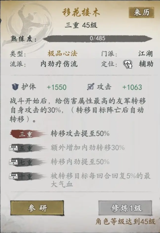 千千心法用移花接木,其他用奶剑套就好,绝招仍然用奶,现在的环境一般千千第一次放绝招就到残局了,残局回血比那个加攻击的阵法有用,这套不缺输出,要注意的是用北冥剑法7重的话,移花接木至少5重,不然主角没有内劲还不如带折梅