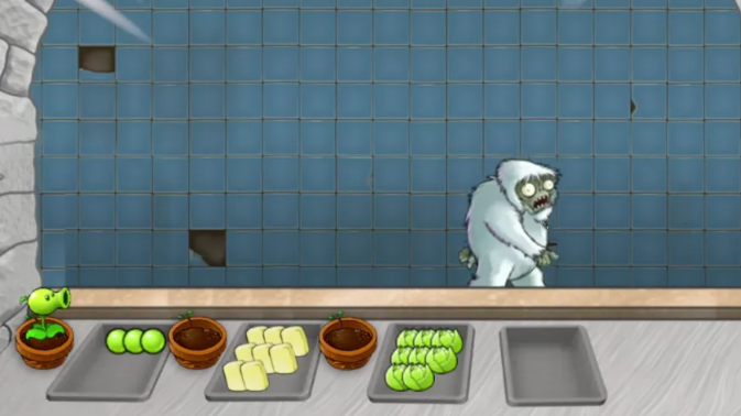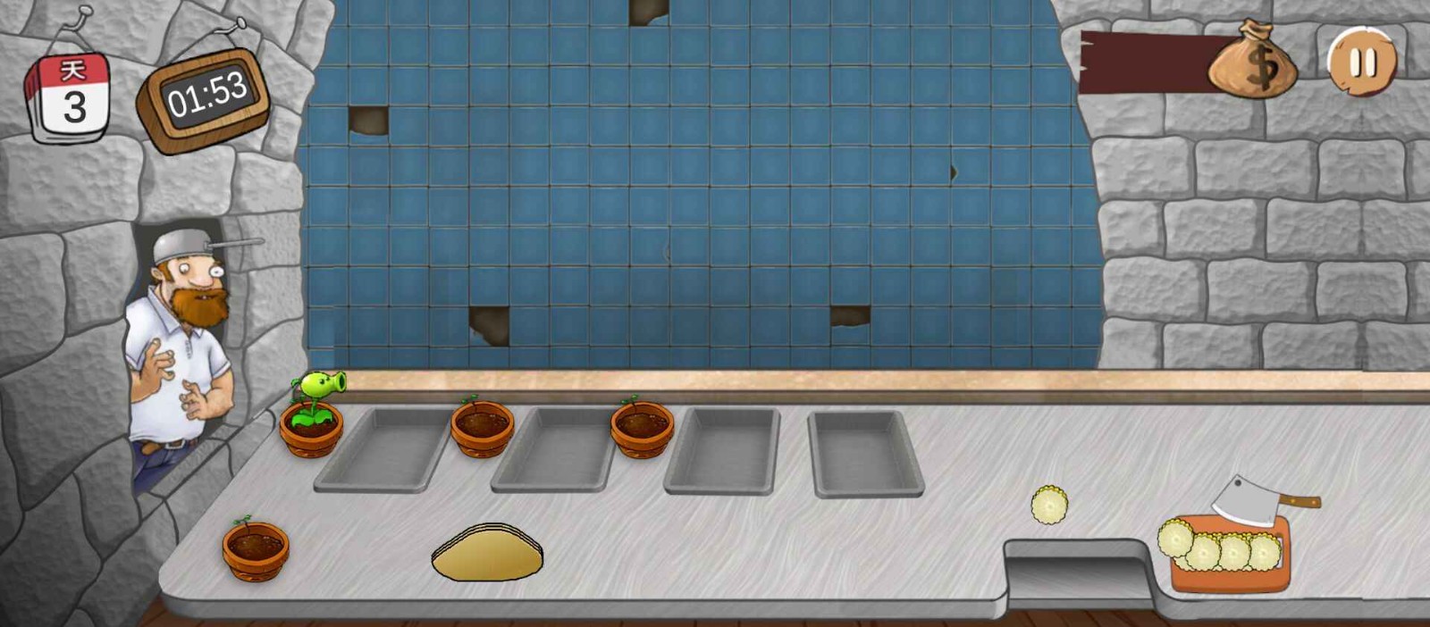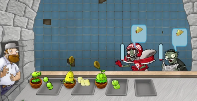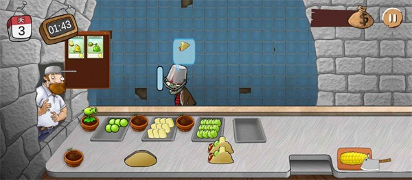 2.游戏第一位顾客是橄榄球僵尸。不同的僵尸有不同的口味爱好。食材有豌豆、头菜、玉米等等。玉米得自己手切。所以我们有钱先解锁更高效的烤箱、特殊的调味料。才能更快的满足僵尸顾客。